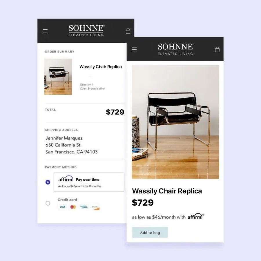 Choose your favorite furniture and add it to your cart. At checkout, select Affirm as your payment option for an easy, real-time financing decision.